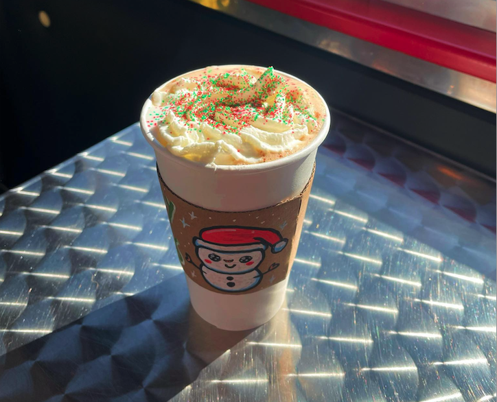 A warm blend of velvety white chocolate and smooth vanilla, infused with a hint of cinnamon and nutmeg, topped with a swirl of whipped cream and festive red & green sprinkles.